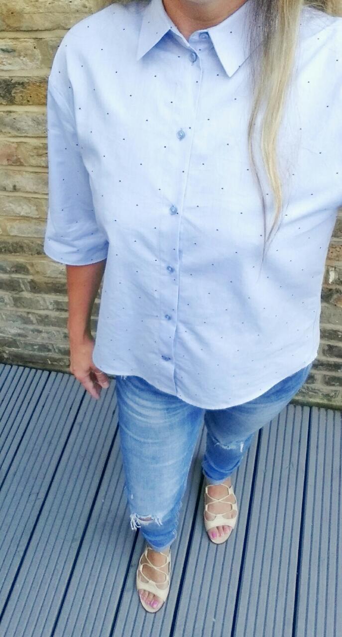 This mixed weather has me feeling all…masculine(!?) So I bought this blue with red polka dot shirt from Zara, ripped skinny jeans and open toe lace up ballerinas (I refuse to believe summer is completely over). T-Rex was feeling androgynous too and so wears my absolute bargain apple green sunglasses bought in the Zara sale.