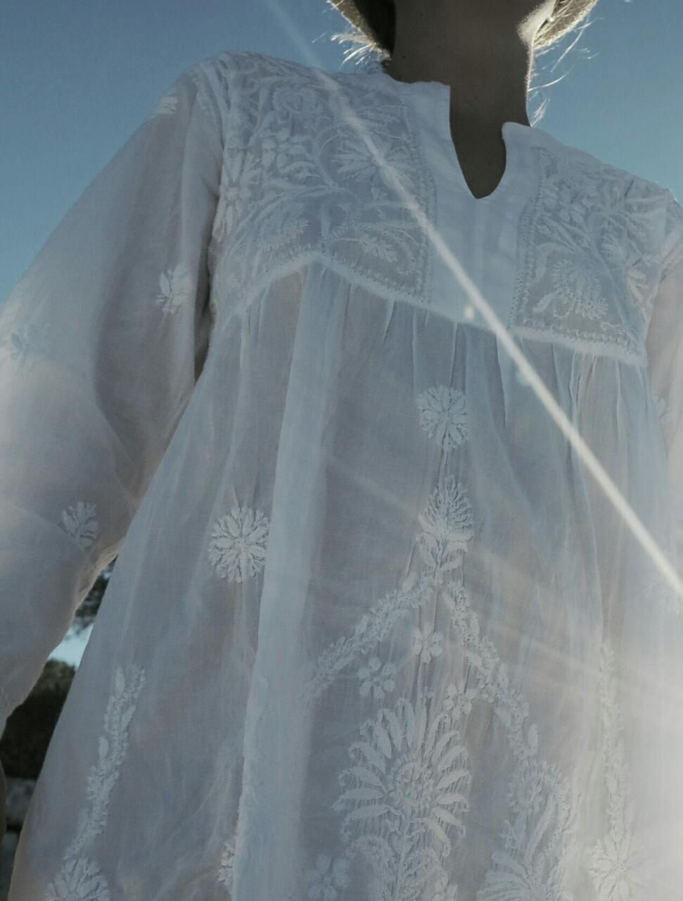 I’m always so envious of the effortlessly chic ‘white dress wearers’ you see on holiday. It’s such a sophisticated look that I associate with walking barefoot down a jetty in St Barts or drinking in a colonial tea house in Sri Lanka. Finding the right white dress to suit you isn’t always easy and so it was nice to have the decision taken out of my hands when new brand, Dilli Grey sent me this white hand embroidered tunic.