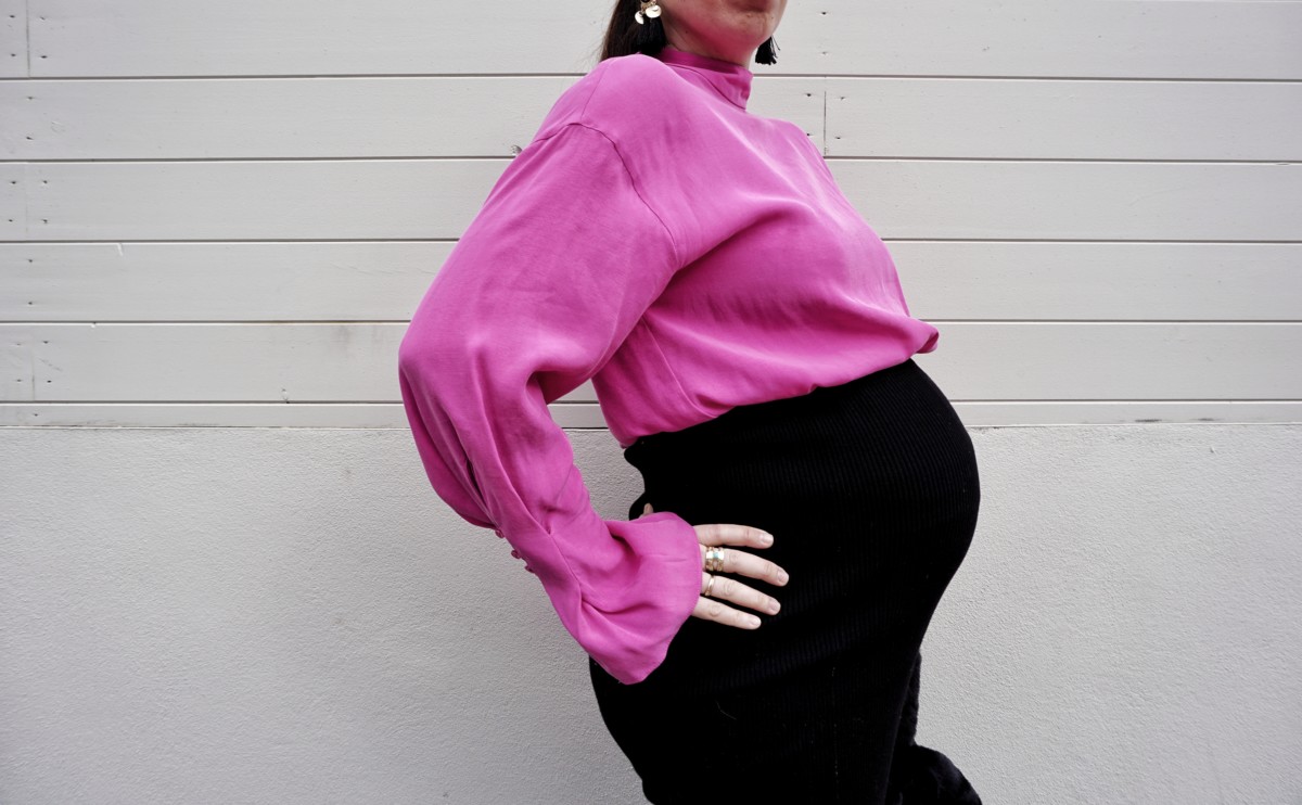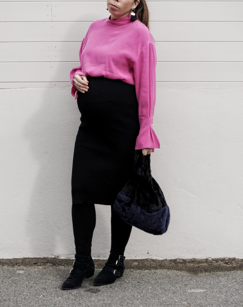 I find a lot of maternity specific tops a bit boring if I’m honest…they are usually monochrome or stripes and a very plain shape. There ARE normal tops out there that fit over big bumps, you just need to know what to look for. You need to find tops that are long enough to cover the bump and the band on maternity jeans but not SO long that it cuts your body in half. I find either long tailored sleeves very flattering or if the top is quite close fitting then mid -length bell sleeves are also flattering. This pink one from Zara is long enough to wear with maternity jeans but also works tucked into my knit skirt.
