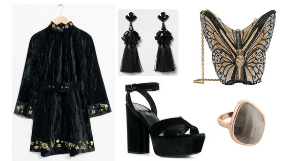 I know it’s traditional to go sparkly at Christmas but I’m loving all these rich and decadent velvets. This dress from one of my high street favourites andotherstories with statement earrings and this very special butterfly clutch from Judith Leiber.
